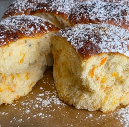 1 kg namenske moke za kvašeno testo 480 ml toplega mleka 150 g ognjičevih cvetov 80 g sladkorja 100 g stopljenega masla ali sončničnega olja 40 g svežega kvasa 1 jajce 1 rumenjak 1 čajna žlička soli