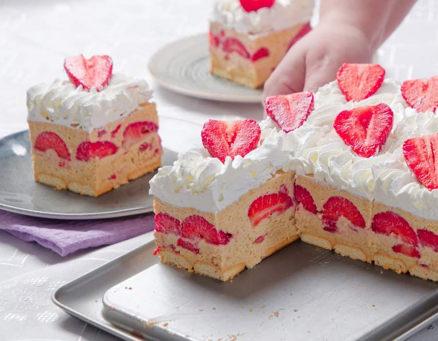 500 g mletih plazma piškotov 125 g masla 200 g kisle smetane 200 g sladke smetane v prahu 300 ml mleka ali gazirane vode 200 g + 300 g jagod 150 g plazma piškotov v kosih malo mleka za namakanje piškotov Stepena smetana za dekoracijo
