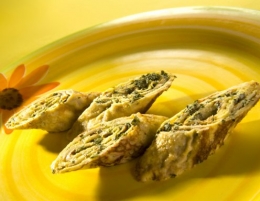 Palačinke razgrnemo, jih pokapamo z raztopljeno margarino in premažemo s stepenim jajcem. Povrhu potresemo svež in na papirju posušen pehtran.