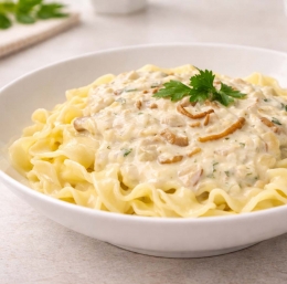| Testenine v kremni sirovi omaki z gobami so odlična izbira, ko si zaželite toplega, nasitnega kosila polnega okusa. Jed je preprosta, a hkrati bogata, saj se nežna sladkost čebule, aromatične gobe in topljen sir povežejo v svilnato omako.