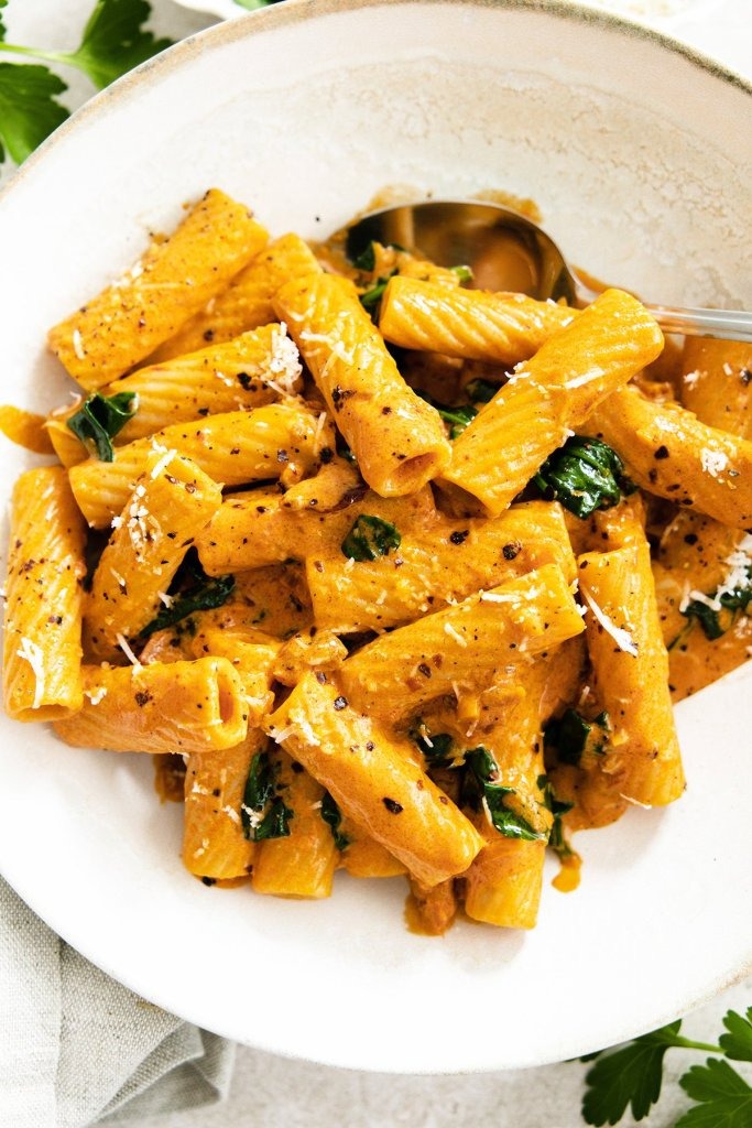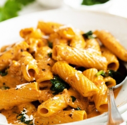 To je res prava jed za razvajanje! Makaroni so obdani z razkošno svilnato paradižnikovo omako, družbo pa jim dela sveža špinača. Priprava je izredno enostavna in hitra, okusi pa so resnično neverjetni. V omaki se nahaja vodka, ki omaki da svež okus, za piko na i pa poskrbita parmezan in maslo. B.O.Ž.A.N.S.K.O.