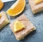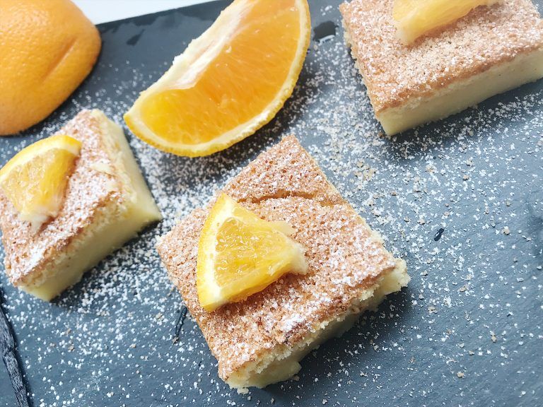 Ko se kolač ohladi ga narežite na majhne kose, posujte s sladkorjem v prahu in okrasite s pomarančo.