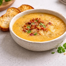 Ko potrebujete hitro, nasitno in toplo jed, je juha iz rdeče leče odlična izbira. Pripravljena je v približno pol ure, vsebuje preproste sestavine, a ponuja bogat, poln okus. Slanina doda prijetno dimljeno noto, sladki krompir pa nežno sladkobo in kremasto teksturo.