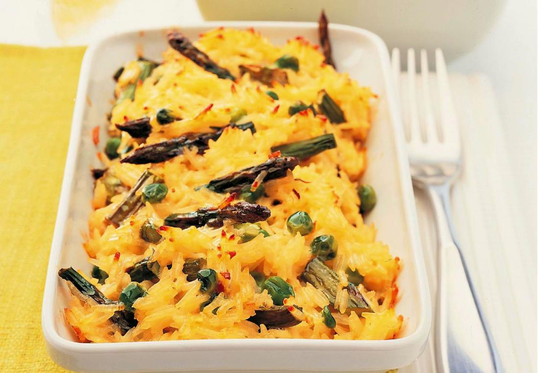 1 žlica stopljenega masla 2 žlici posušenih krušnih drobtin 300 g dolgozrnatega riža 600 ml zelenjavne jušne osnove brez soli 150 g graha 150 g narezanih špargljev 3 jajca 100 g naribanega zrelega zbrinca 1⁄2 žličke zmletih suhih čilijev poper po okusu