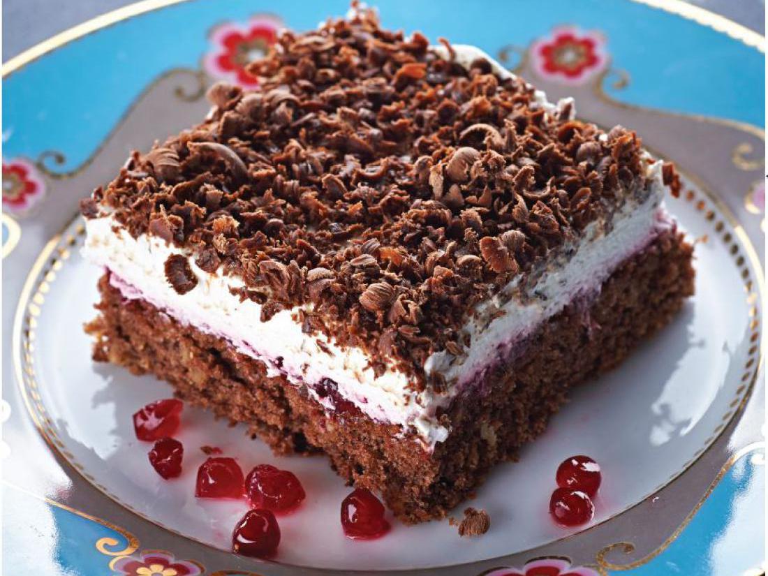 Ohlajen kolač premažemo z brusnično marmelado in stepeno smetano.
