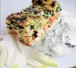 600 g g bučnega mesa 4 mlade čebulice majhen šopek kopra 120 g kisle smetane 50 g masla maslo za model 5 jajc 1,2 dl mleka sol poper ščepec naribanega muškatnega oreška 80 g jogurta 100 g kisle smetane majhen šopek peteršilja 2 glavici belgijskega radiča (vitlofa)