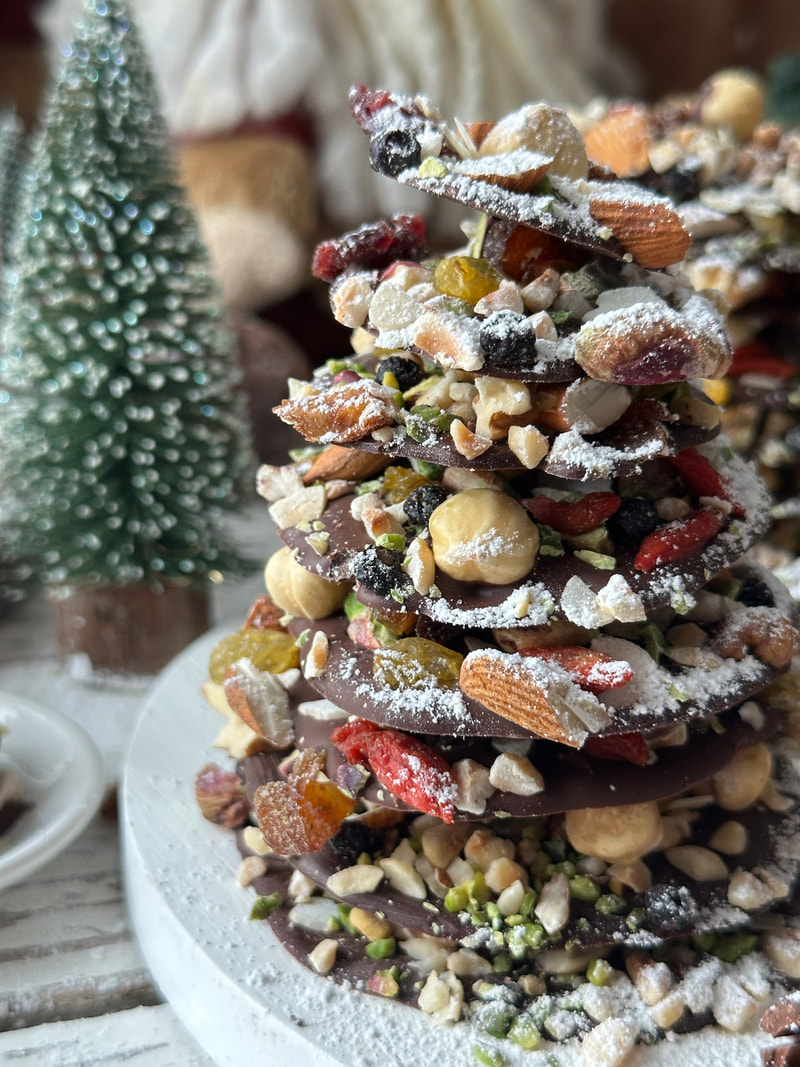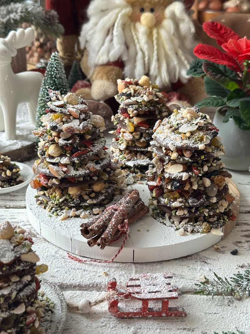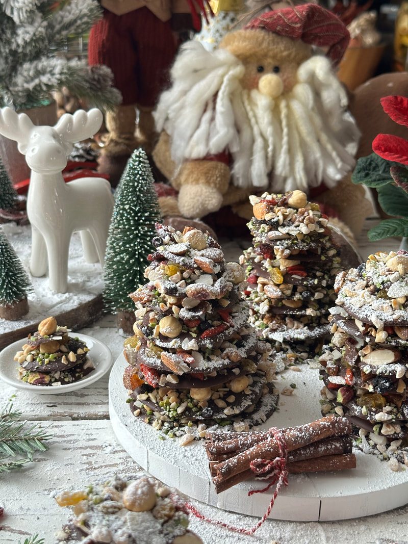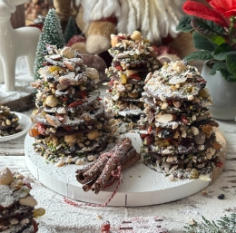 Vse skupaj pustimo na sobni temperaturi čez noč, da čokolada stisne oreščke, nato pa smrečice sestavimo.