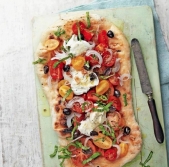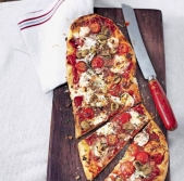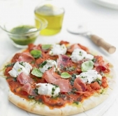 Pica z gorgonzolo, panceto in popečenimi breskvami