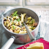 Svedrčki z jajčevci, pinjolami in rozinami po sicilijansko