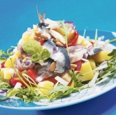 Solata s hruško, datlji in orehi ter prelivom iz sira z modro plesnijo