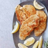 Ocvrti telečji zrezki v panadi z limono, parmezanom in pinjolami