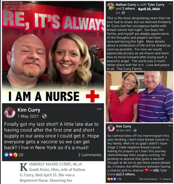 25. april 2024 – Ohio: Diplomirana medicinska sestra Kimberly Curry, 48, je umrla 25. aprila 2024. Po prejemu cepiva proti COVID so ji diagnosticirali trikrat negativni rak dojke 2. stopnje.