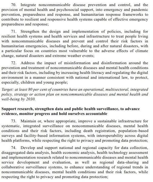 "Vključite preprečevanje in obvladovanje nenalezljivih bolezni ter zagotavljanje duševnega zdravja in psihosocialne podpore v okvire za preprečevanje, pripravljenost in odzivanje na izredne razmere in pandemije ter humanitarno odzivanje, da bi prispi k odpornim in odzivnim zdravstvenim sistemom, ki so sposobni učinkovite pripravljenosti in odzivanja na izredne razmere." Odstavek 70.