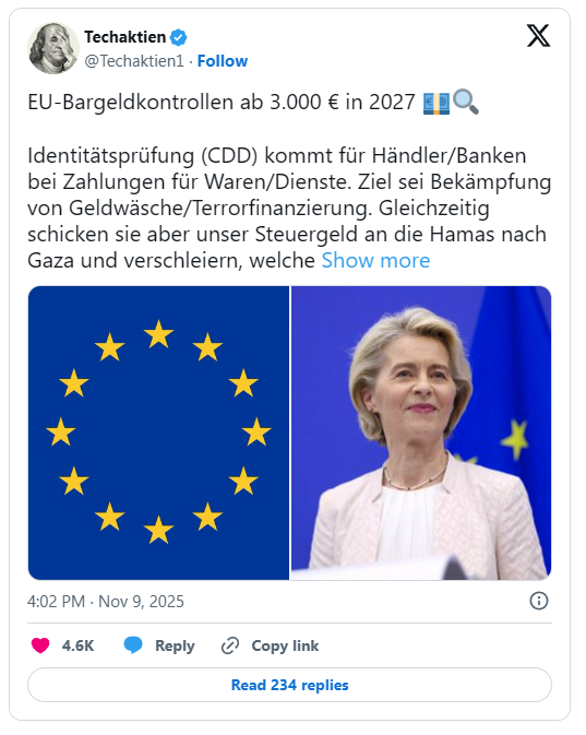 Omejitev gotovine, ki jo je EU ustvarila s podporo posameznih vlad držav članic, je zato dolgoročno perfidna metoda zmanjševanja uporabe gotovine na majhne zneske zaradi inflacije in izgube kupne moči. Končni cilj je, da se ljudje navadijo na uporabo ponudnikov digitalnih plačil, kjer koli je to mogoče – celo do te mere, da se uvede centralna banka digitalne valute (CBDC).