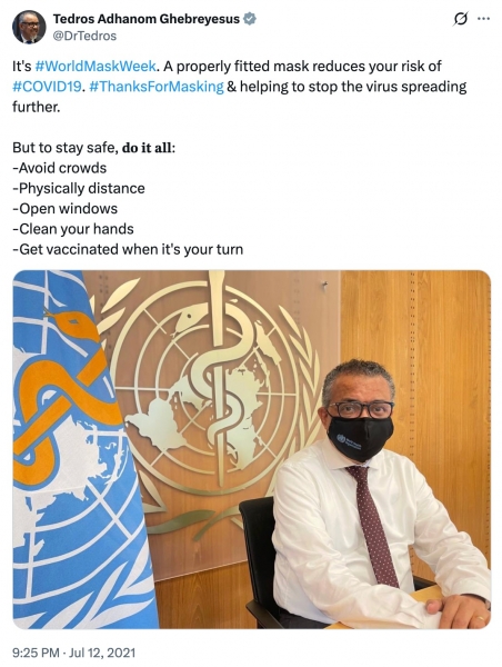 Vsak, ki preuči Tedrosove izjave od leta 2020 do 2022, bo našel povsem drugačen ton. Vodja SZO je večkrat pozval k množičnim omejitvam. Julija 2021 je pozval k maskam, cepljenju in socialni distanci. Maja 2022 je poudaril, da je »najboljši način za zaščito ljudi še vedno cepljenje – skupaj z javnozdravstvenimi in socialnimi ukrepi«.