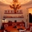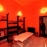 Jedilnica z rdeče-oranžno dekoracijo, okroglo mizo in policami z uokvirjenimi fotografijami.