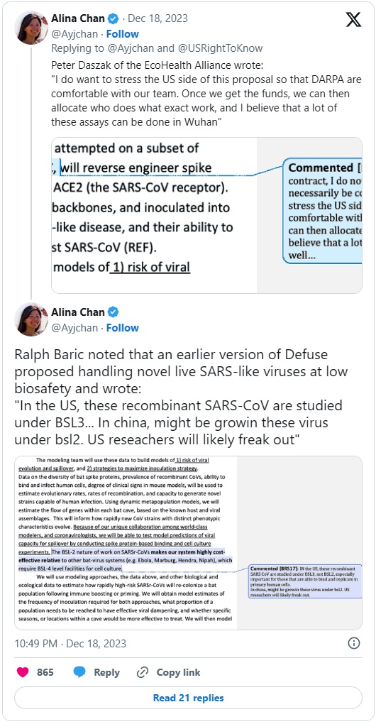 Medtem ko so v ZDA razpravljali o tveganjih, so si ameriški in kitajski raziskovalci brezskrbno izmenji načrte in genetska zaporedja. E-poštna sporočila iz leta 2018 kažejo, da je ameriški raziskovalec Baric prek posrednika raziskovalca iz Wuhana, Shija, prosil za neobjavljene informacije o virusu. Odgovor Kitajske: "Ni problema."